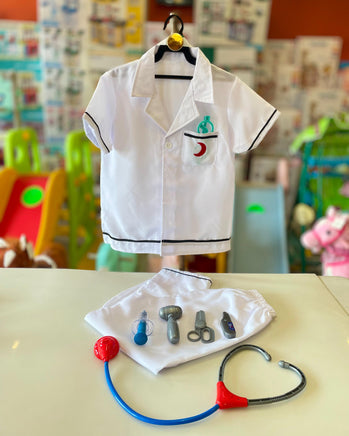 Includes jacket, pants, thermometer, stethoscope, syringe, and glasses.