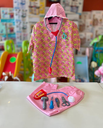 Includes jacket, pants, thermometer, stethoscope, syringe, and glasses.