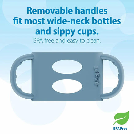 Easy-to-hold removable 100% silicone handles; handles fit most wide bottles & sippy cups