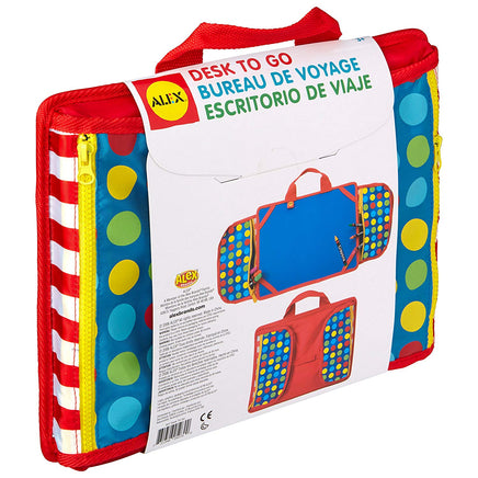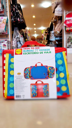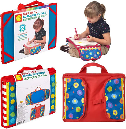 On the go and need a sturdy surface to draw and color? Desk to Go is the perfect solution! It has a firm desk top for writing, coloring, and drawing. Side pockets hold art supplies, and then fold and fasten making it easy to carry. The beanbag-filled underside makes it comfortable for children to rest on their laps. Elastic straps keeps paper & pads in place. Best with a 9?x12? pad but can also accommodate 8 1/2? x 11? paper. Supplies shown sold separately. Use it wherever your child needs a desk to keep busy. A great toy when traveling – bring it on your next road trip or plane ride.