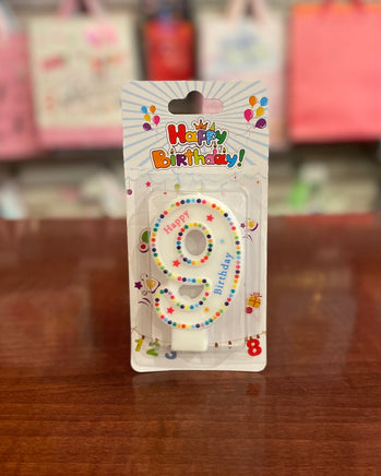 Celebrate your special day with the Polka Dot #9 Candle! This vibrant cake decoration is shaped like the number 9 and features festive polka dots. The wax candle is 1.5" x 3" and is perfect for event planners, caterers, and home hostesses alike. Coordinate with other polka dot party supplies for a complete look. Make your birthday party decorations and accessories even sweeter with the Polka Dot #9 Candle from Creative Converting.