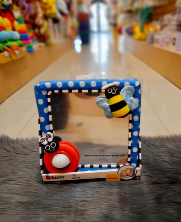 Encourage baby to focus on a human face with the large true-reflection mirror. The attached symmetrical butterfly inspires vision and encourages tactile exploration. The high contrast ladybug and tracker ball aids in the development of baby’s visual perception while the textured leaves offer peek-a-boo play. The soft frame of the mirror is perfect for baby’s environment, and the easel back allows the mirror to stand on flat surfaces.