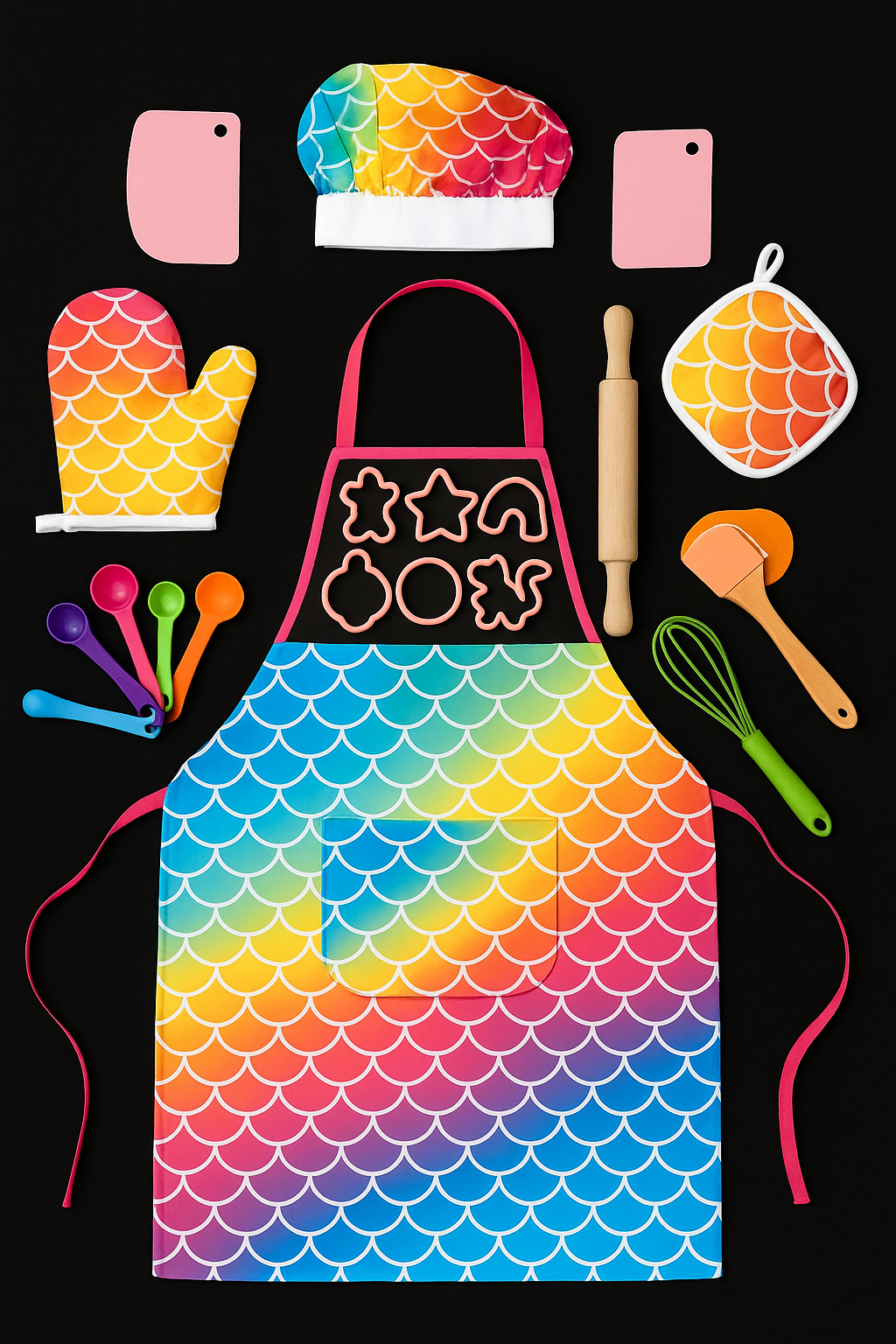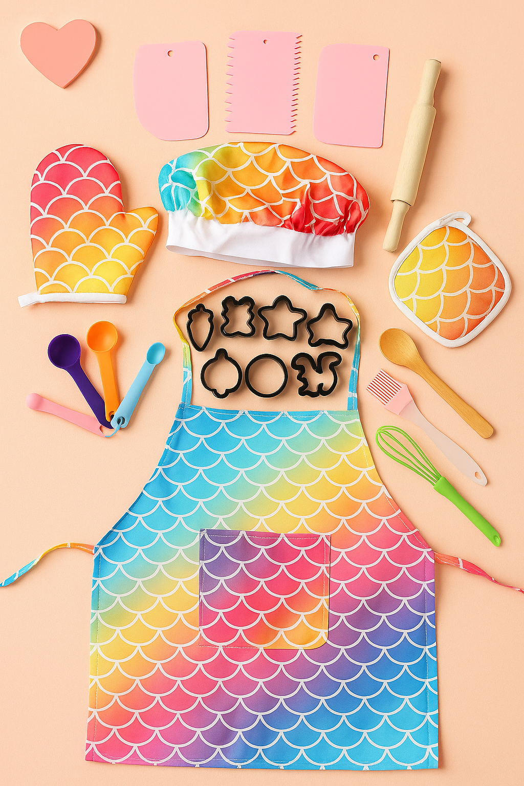 Featuring a vibrant mermaid-scale apron, matching chef hat, cute oven mitt and pot holder, plus a full set of child-friendly baking tools, this set is perfect for fun family baking days, pretend-play kitchens, birthday gifts, and holiday surprises.