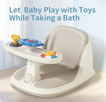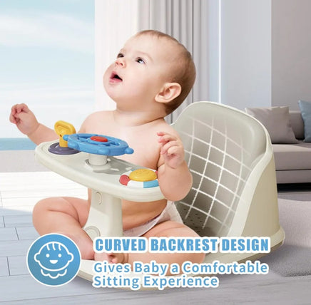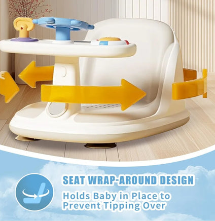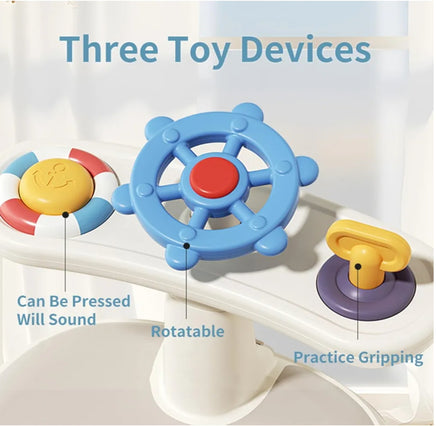 The tray includes colorful toys (like a steering wheel and buttons) to develop motor skills and hand-eye coordination.