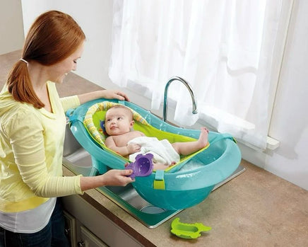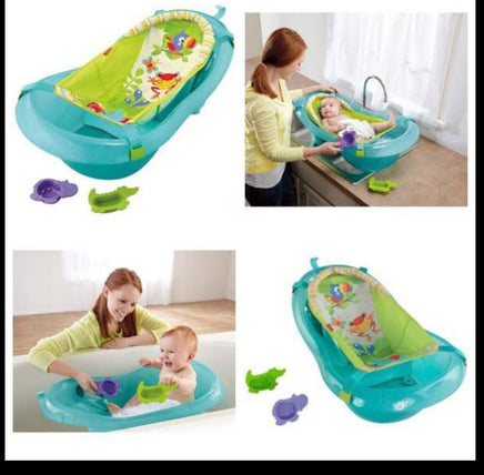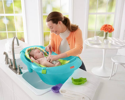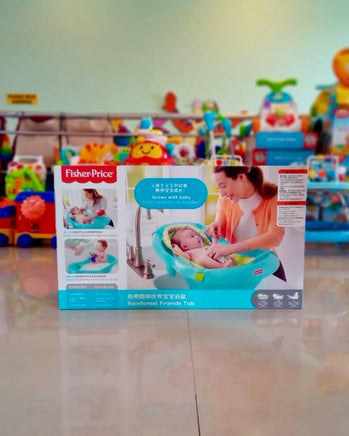 Three grow-with-me stages and two rainforest friends make bath time more relaxing and fun for everyone! Soft, padded sling comfortably cradles newborns in Fisher-Price Rainforest Friends Tub. When baby outgrows the removable sling, the baby-stopper insert keeps baby comfortably reclinedno slipping or sliding around! Insert removes, too, so toddlers can sit up and play in a roomy tub just their size. Hippo pouring cup and alligator strainer are handy tools for bathing, and fun bath friends for play!