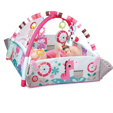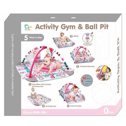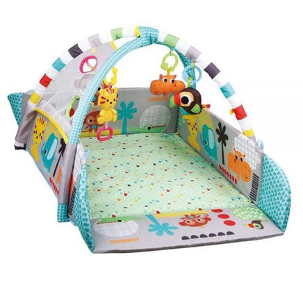 This isn't your average play gym! The 5-in-1 Your Way Ball Play Activity Gym from Bright Starts is a 48" jumbo mat and play gym with walls that can be adjusted up or down. Walls up keeps balls inside and acts as a barrier during play time and tummy time. 35 colorful balls extend the life of this gym into the toddler years because with all walls up - it becomes a ball pit! Engaging toys include an electronic toucan that entertains baby with over 20 minutes of merry melodies. A plush elephant, monkey bead chaser and more jungle themed toys including leaf-shaped teethers, a discover me baby safe mirror, crinkle fabrics, rattles, prop pillow and even a character bag to help baby experiment with put and take development. From tummy time to toddler time, baby will be having a ball!