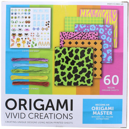 KIT INCLUDES: 60 Sheets Neon Printed Paper, 20 Craft Strings, 1 Sticker Sheet, and Instructions.