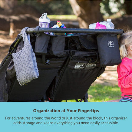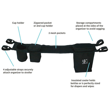 Our Double Cool Double Stroller Console keeps all of your on-the-go essentials within quick reach and easily attaches to any double side-by-side stroller with console-style handlebars, such as double jogging strollers. The Double Cool features a cup holder, one large, zippered insulated cooler and a second zippered compartment to hold personal items like keys or sunglasses. The insulated cooler holds up to 2 bottles and a few snacks. The cooler compartment is also perfectly sized to fit diapers and a wipes case! There’s an exterior mesh pocket to keep your cell phone or pacifiers close. The four adjustable straps securely fasten the console to your stroller handlebar./