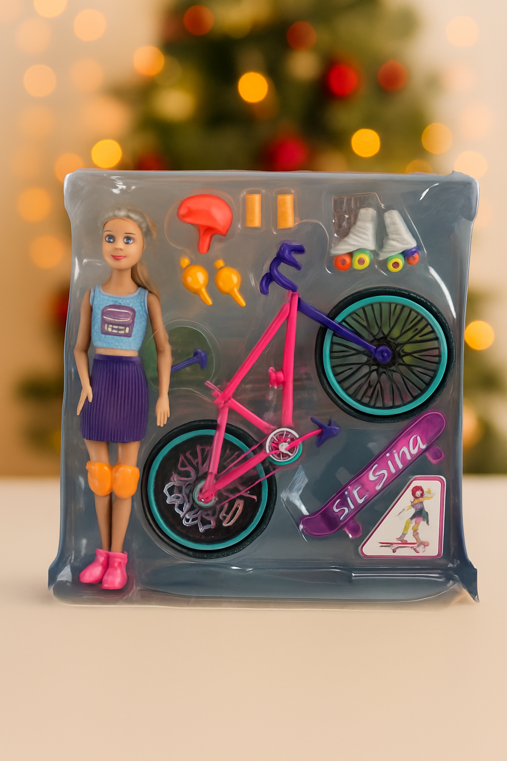 Bring Christmas joy to your little one with this Active Doll Playset! This stylish doll comes with everything she needs for outdoor fun β a bright pink bicycle, a cool surf-style skateboard, roller skates, helmet, knee pads, and more! πβ¨