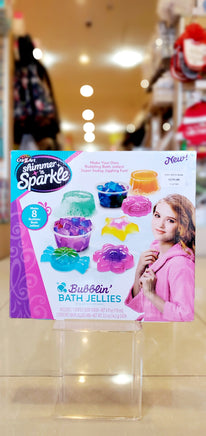 Cra-Z-Art shimmer 'N sparkles Bubblin bath jellies have arrived! make your own bubbling bath jellies! Super sudsy jiggling fun! this box makes 8 Bubblin bath jellies! shimmering, sudsy, jiggly soap making fun! colorful gell-o cups for bath or shower time! ages 8 and up.