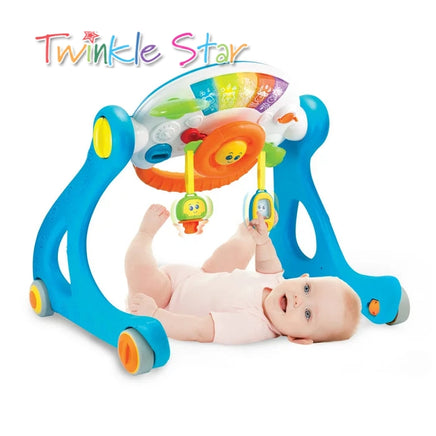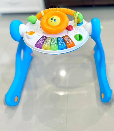 Sit to stand dashboard and walker, adjustable play panel can be angled to suit developing baby’s needs