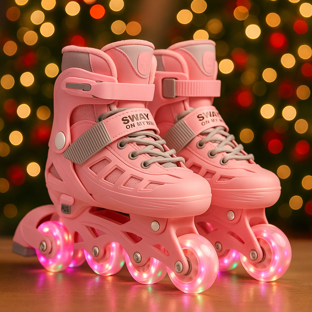 These are stylish pink adjustable inline skates for kids from 4.5" to 5.5" , designed for both fun and safety. Featuring a sturdy high-ankle boot with breathable padding, they provide excellent ankle support and comfort during skating. The skates come with secure lace-up fronts, Velcro straps, and an additional locking buckle for a snug fit. The durable wheels include LED lights that flash while skating, adding a bright and playful touch. This set also appears to include essential accessories such as a carrying bag, helmet, knee pads, elbow pads, wrist guards, and training cones—making it perfect for beginners and young skating enthusiasts.