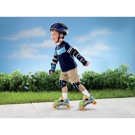The set includes roller skates and accessories: knee pads, elbow pads, helmet