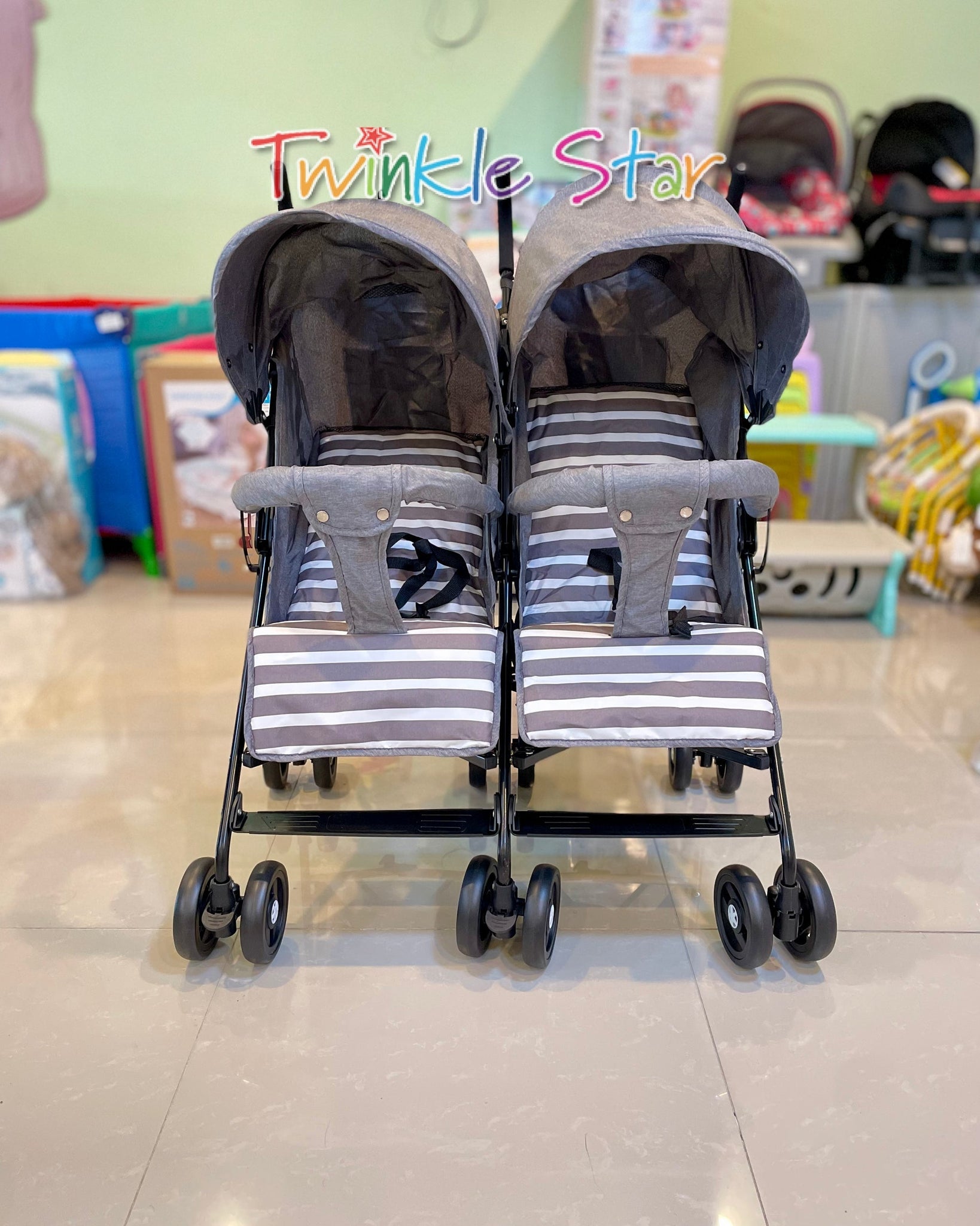 Twin Umbrella Stroller is perfect for parents with twins or different age siblings.Comes with a removable front bar (can only be removed with the help of tools). It has large adjustable hoods with mesh inserts which not only allow extra ventilation but also let you keep an eye on your kids.